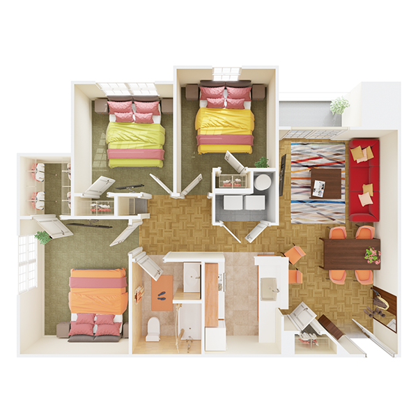 Planta perspectivada consiste na modelagem de todo o imóvel com as paredes cortadas a aproximadamente 1 metro de altura, variando de acordo com o projeto. Esta variação de maquete eletrônica é uma excelente opção para apresentação de apartamentos.
